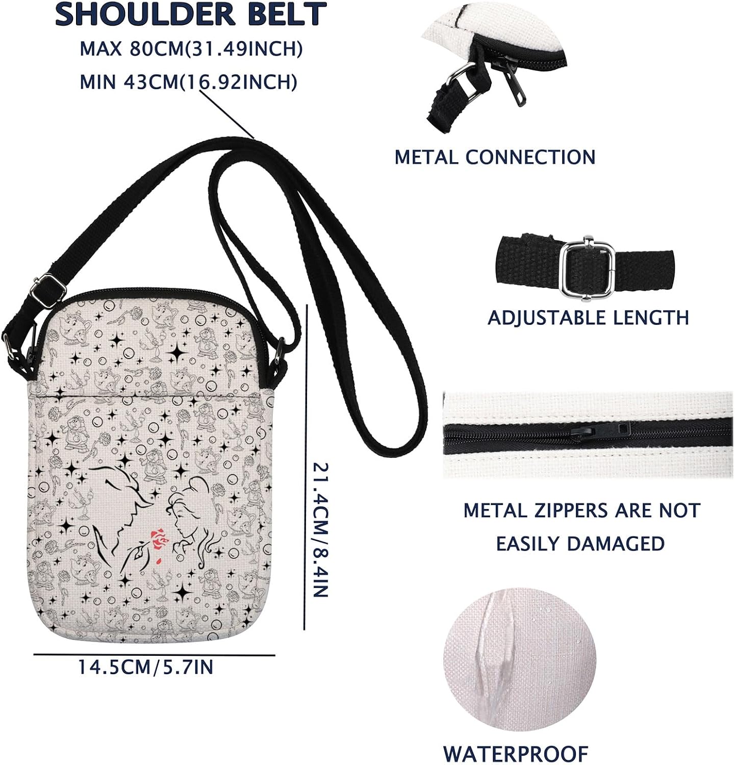 The Beauty Beast Crossbody Bag offers a charming and compact design. Its color scheme and patterns closely align with the Beauty and the Beast theme, featuring a blend of soft pastels and intricate illustrations. The design is simple yet elegant, making it a perfect accessory for fans of the classic fairytale.